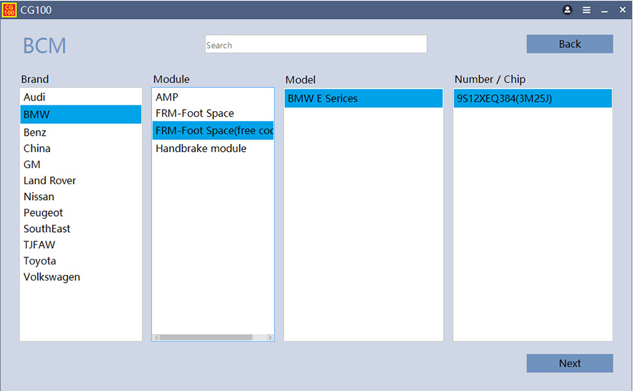Функция BCM‑ремонта охватывает популярные модули: FRM BMW, ZGS Mercedes‑Benz, BCM Audi, Land Rover, Nissan, Peugeot, Toyota, Volkswagen. Устройство позволяет считывать данные, устранять ошибки и восстанавливать работу систем освещения, кондиционирования и других электронных узлов.